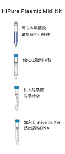 本产品采用加厚硅胶中量柱,适合于从30~150ml 细菌培养液中提取高达250µg 的质粒 DNA,纯化的质粒可直接用于自动测序、酶切、PCR 和标记等。40 分钟可以完成数个样品的抽提工作, 整个操作过程不需接触酚氯仿等有机物抽提,也不需用到耗时 的醇类沉淀。