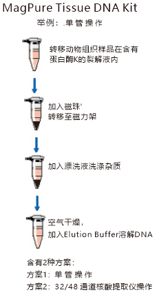 本试剂盒采用磁珠纯化技术,只需通过磁场就可以实现分离过程。血液等液体样品在裂解液和蛋白酶K的共同作用下裂解消化,DNA从胞内释放出来,加入结合液和磁珠进行混合,DNA被选择性地吸附到磁珠的表面,在磁场的作用下,磁珠被吸附和转移,蛋白质等杂质随废液一起去除。吸附DNA的磁珠经过清洗去除杂质,最后用少量洗脱液或水洗脱出DNA,磁珠在磁场作用分离去除。  |