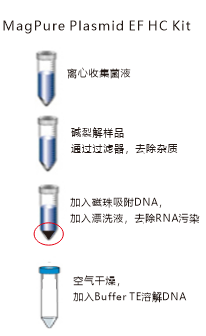 | 本试剂盒采用磁珠纯化技术,只需通过磁场就可以实现分离过程。细菌经离心收集后,首先用碱裂法进行裂解中和,并通过离心去除蛋白质和基因组DNA;加入磁珠和结合液至上清液中进行混合,质粒DNA被磁珠的表面二氧化硅微粒选择性吸附,并经磁场分离或转移,吸附DNA的磁珠经过两次清洗去除杂质,最后用少量洗脱液或水洗脱出DNA,磁珠在磁场作用分离去除。 | |