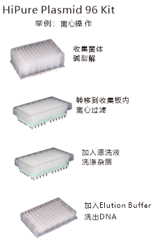 本产品采用96孔硅胶板和改良碱裂解溶液体系,适合于从1~5ml 细菌培养液中提取高达30µg 的质粒 DNA,纯化的质粒可直接用于自动测序、酶切、PCR 和标记等。50 分钟可以完成数个样品的抽提工作, 整个操作过程不需接触酚氯仿等有机物抽提,也不需用到耗时的醇类沉淀。