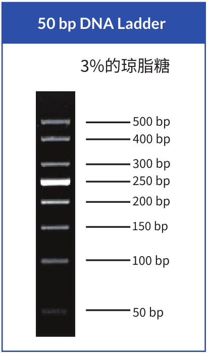 | 本产品由大小分别为500 bp、400 bp、300 bp、250 bp、200 bp、150 bp、100 bp和50 bp共8条双链DNA组成,可作为琼脂糖凝胶电泳或聚丙烯酰胺凝胶电泳中双链线状DNA分子量大小的参照。其中250 bp为指示带,浓度约为150 ng/5 µL,其余条带浓度均为50 ng/5 µL。本品已混有上样缓冲液,可直接用于电泳。 |