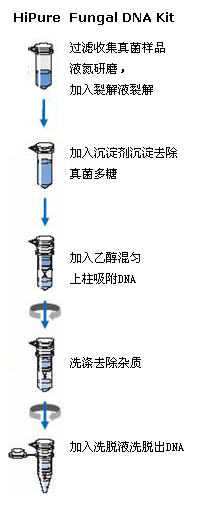 本试剂盒采用玻纤滤膜纯化技术,只需进行简单的结合-洗涤-洗脱的步骤。真菌经离心收集后,经溶菌酶消化去除细胞壁,再经过裂解液和蛋白酶K裂解消化,DNA从胞内释放出来,加入结合液调整最佳的结合条件后转移至纯化柱中并离心,DNA被选择性地结合到滤膜,而蛋白质等杂质由滤出到滤液中。经过两个洗涤步骤除去了残留的污染物和酶抑制剂,最后DNA被少量的水或缓冲液洗脱出来。  |